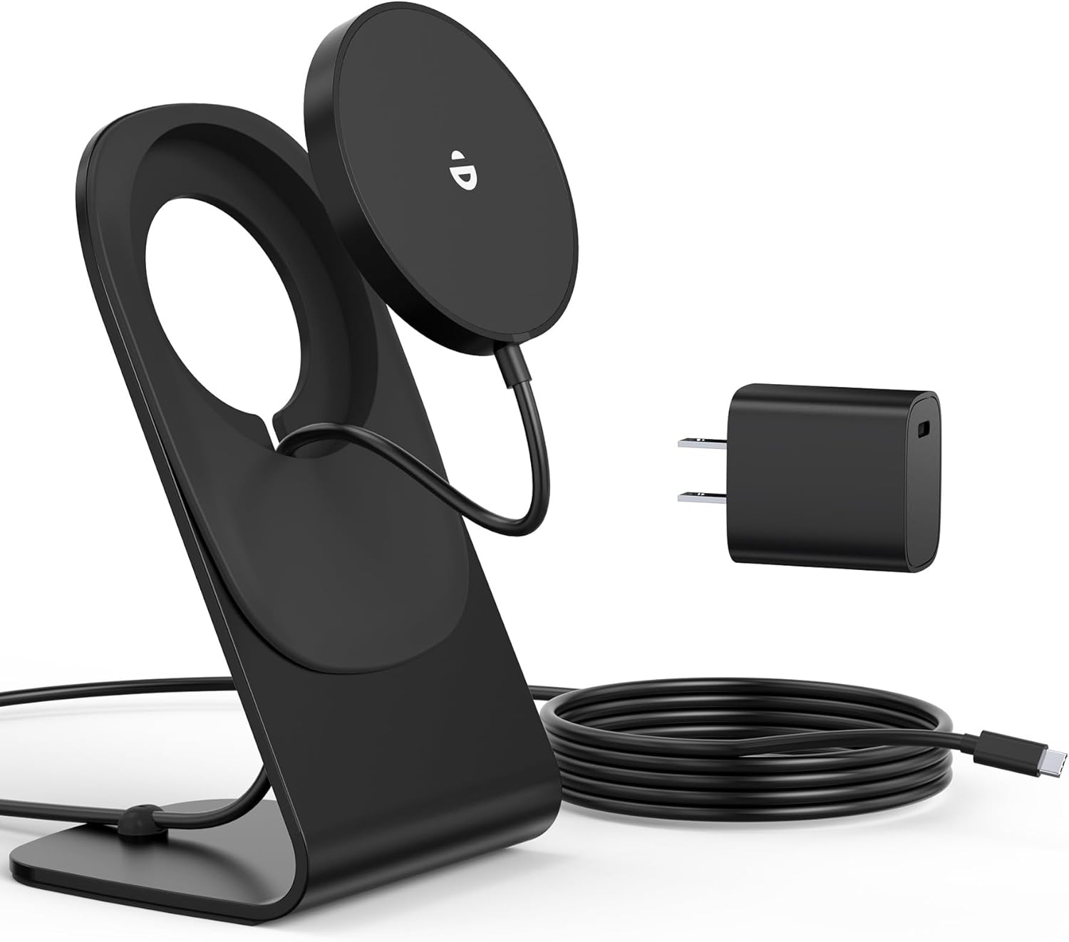 All-in-One Solution – Includes magnetic wireless charger, 20W USB-C PD adapter, and aluminum stand with removable charger.
