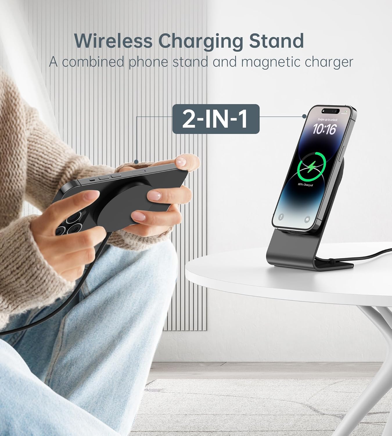 2-in-1 Design – Use as a charging stand (vertical or horizontal) or detach to use as a magnetic charging pad.